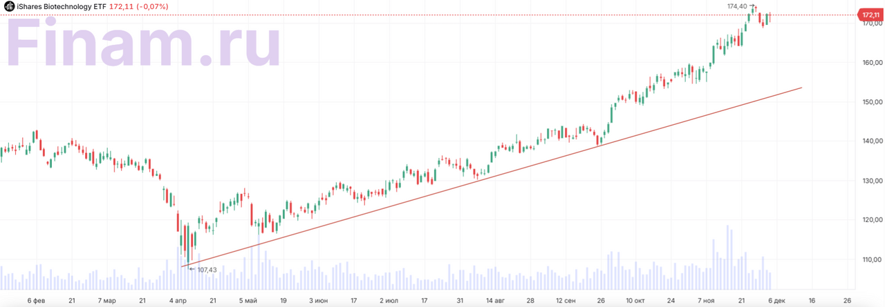 Индексный фонд iShares Biotechnology ETF с привязкой к биотеху более крупного калибра в этом году тоже принес солидную доходность ― порядка 30%, оправдав наши ожидания, и с конца ноября мы скорректировали рейтинг бумаги до «Держать» с сохранением целевой цены $174,8, апсайд 2%. В I квартале 2026 года мы пересмотрим оценку инструмента с учетом новостей и отчетностей за IV квартал.