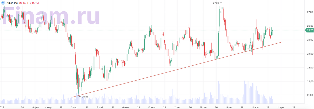 Рейтинг акций Pfizer ― «Покупать», целевая цена $29,2, апсайд — 14%.