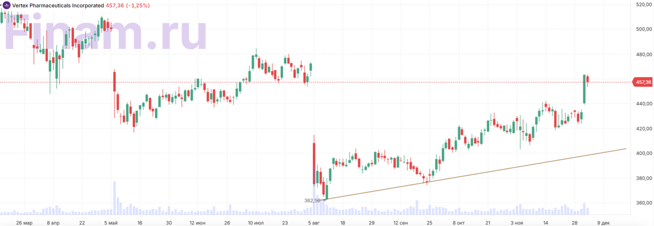Акции Vertex находятся в нашем покрытии с рейтингом «Покупать», целевая цена $517,4, апсайд ― 13%.