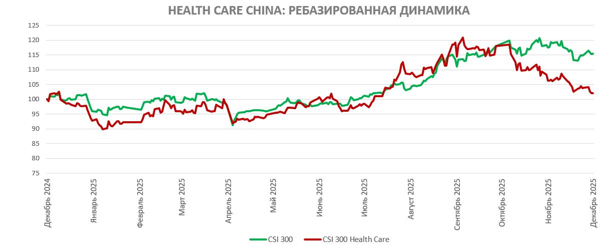 Китайский сектор здравоохранения в IV квартале скорректировался после бурного ралли и показал динамику хуже рынка ― отраслевой субиндекс CSI 300 Health Care с октября просел на 13%, тогда как индекс CSI 300 ослаб на 2%. Картина за 12 месяцев тоже не в пользу отрасли, +2% против +16%.
