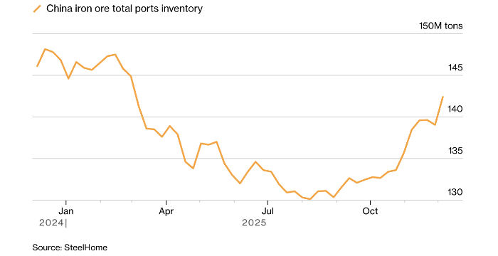 Затянувшийся спад в секторе недвижимости Китая оказал давление на спрос на сталь, однако импорт железной руды в страну в этом году был высоким, достигнув рекорда за 11 месяцев к концу ноября. Запасы в крупных китайских портах сейчас выше среднего сезонного уровня, хотя и ниже, чем в 2024 году.