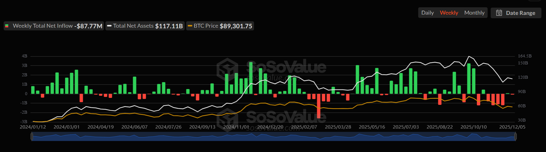 Американские спотовые биткоин-ETF завершили неделю с чистым оттоком в $87,7 млн. Основная часть выведенных средств пришлась на продукт ARKB от Ark Invest и 21Shares — $77,8 млн.