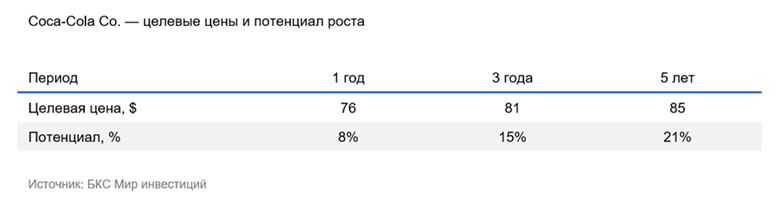 Текущий мультипликатор EV/EBITDA Coca-Cola равен 19,2х. Это чуть ниже исторического медианного значения за последние 5 лет. Мы считаем такой уровень близким к справедливому, у нас «Нейтральный» взгляд на акции компании. Наша целевая цена на ближайшие 12 месяцев составляет $76 с потенциалом роста 8%.