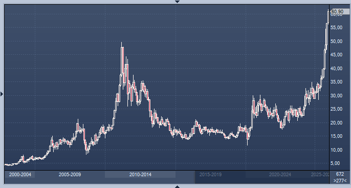 Спотовая цена на серебро выросла на 1,1%, до 61,34 доллара за унцию, после достижения исторического максимума в 61,61 доллара ранее в этот же день. Серебро продолжает дорожать после того, как во вторник его цена превысила 60 долларов за унцию. Увеличение стоимости серебра связано с его широким использованием в промышленности на фоне нехватки предложения и резкого роста спроса в этом году.