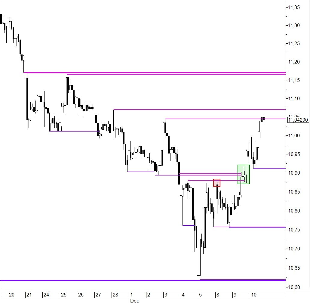 Юань быстро преодолел техническое препятствие в виде психологически важного уровня 11 руб., но вошел в область более серьезного сопротивления 11,04–11,07 руб. Если удастся над ней закрепиться, следующей целью восстановления пары CNY/RUB может стать трехнедельная вершина 11,17 руб.