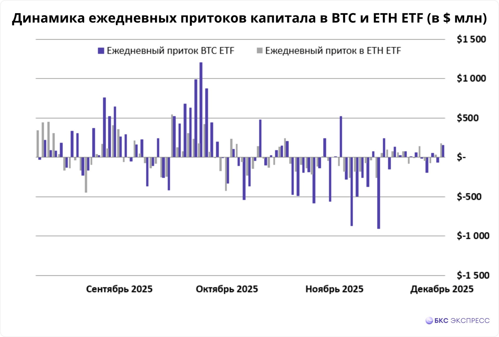 • Динамика в криптовалютных ETF стабилизировалась: крупные оттоки капитала из фондов прекратились. Однако общая динамика переменчивая. За вчерашний день: +$151 млн по BTC (максимум с 21 ноября) и +$177 млн по ETH (максимум с 28 октября). Локально эфириум выглядит немного интереснее. О причинах писали во вчерашнем материале.