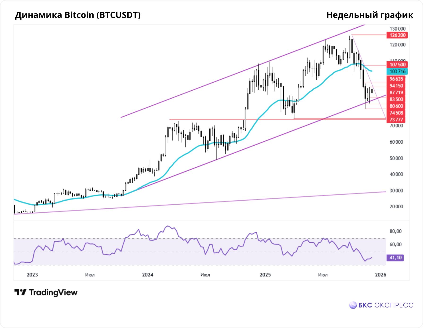• Долгосрочная картина — за покупателями. Восходящий канал от октября 2023 г. сохраняет силу. Его нижняя граница проходит в районе $86 000.