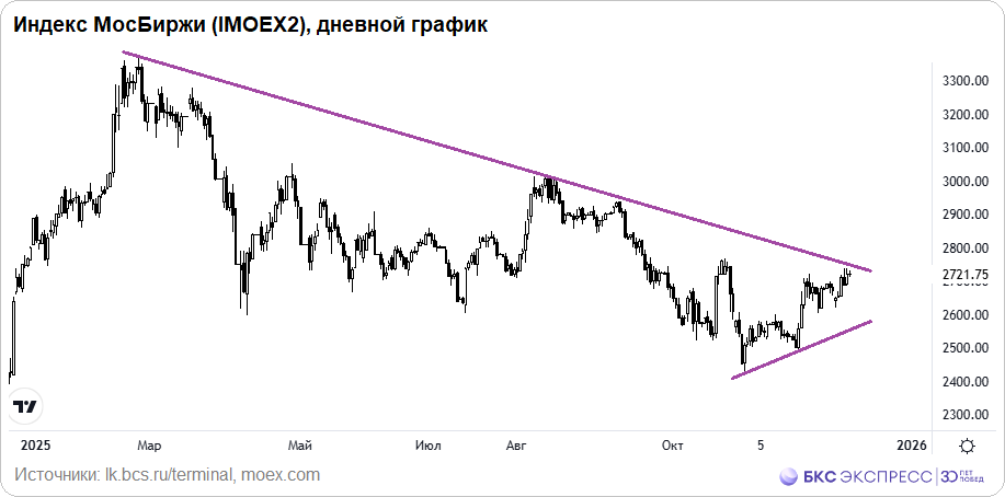 Технически — боковик на рынке обычно временный, а выход из жесткой консолидации, как правило, сильный. Нужен лишь драйвер движения. Скорее всего, им станет важная новость, способная усилить позиции одной из сторон биржевого процесса — либо медведей, либо быков. Ближайший ориентир-сопротивление на межсессионном гэпе от 20 октября, под 2745 п., там же будет и годовой динамический нисходящий тренд. Если прорвутся выше, то вероятно резкое ускорение к 2850 п., а далее и круглые 3000 п. Локальная поддержка — 2700 п., а еще ниже — 2650 п. Предпочтение — за вариант вверх.