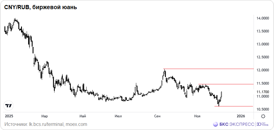 Ожидается дальнейшее восстановление курсов инвалют, а скорость роста валютных пар может быть высокой. Факторы — снижение ставок и сокращение профицита внешней торговли. Промежуточные сопротивления — круглые 80 за доллар, евро к 95, юань по 11,5. Среднесрочные целевые — доллар за 85, евро к 100, юань по 12.
