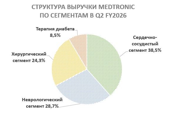 По итогам второго фискального квартала, завершившегося 25 октября 2025 г., выручка Medtronic достигла $8,96 млрд (+6,7% г/г), на $100 млн выше консенсус-прогноза. Чистая прибыль по GAAP увеличилась на 24% г/г и достигла $819 млн. Скорректированная прибыль на акцию составила $1,36 (+9% г/г), превысив ожидания на 5 центов.