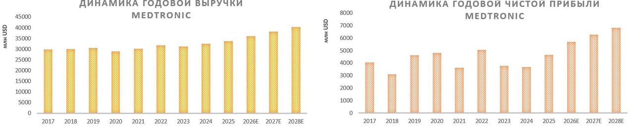 Годовая выручка Medtronic за последние годы возобновила положительную динамику, и чистая прибыль в 2025 фискальном году* также показала рост после 2 лет просадки.