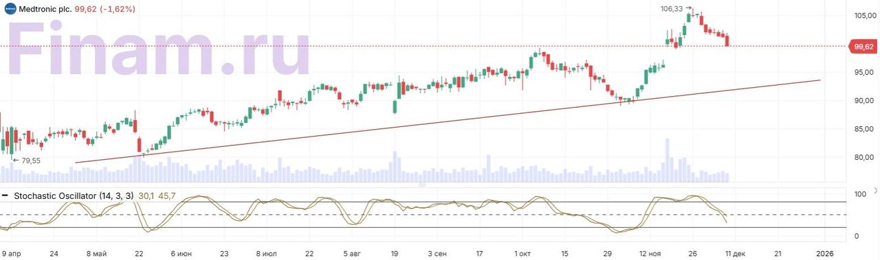 За период с начала года акции Medtronic показали динамику с опережением рынка и сектора — ушли в плюс на 25%, тогда как индекс S&P 500 за тот же период прибавил 16%, а отраслевой индексный фонд iShares U.S. Medical Devices ETF окреп на 6%.