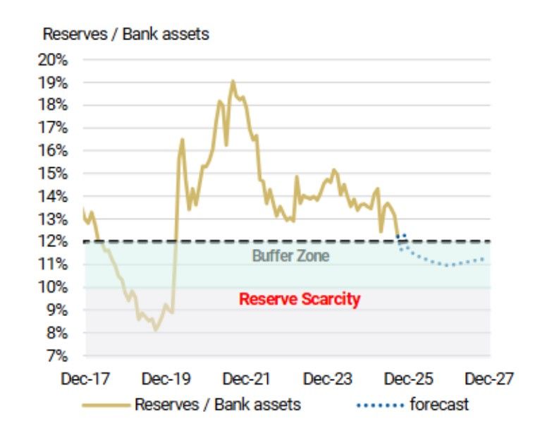 После этого ожидается, что объем покупок резервов сократится, хотя фактические темпы будут зависеть от рыночных условий. Это решение последовало практически сразу после завершения программы количественного ужесточения QT, действовавшей с июня 2022 г по 1 декабря 2025г, в ходе которой баланс ФРС сократился с почти $9 трлн до $6,6 трлн. По словам Пауэлла, цель новой программы приобретения краткосрочных гособлигаций не связана с направленностью ДКП (в отличие от классической программы QE), она направлена на то, чтобы не допустить дефицита резервов в банковской системе и проблем с ликвидностью, из-за которых ФРС может потерять контроль связи своих процентных ставок со ставками денежного рынка.