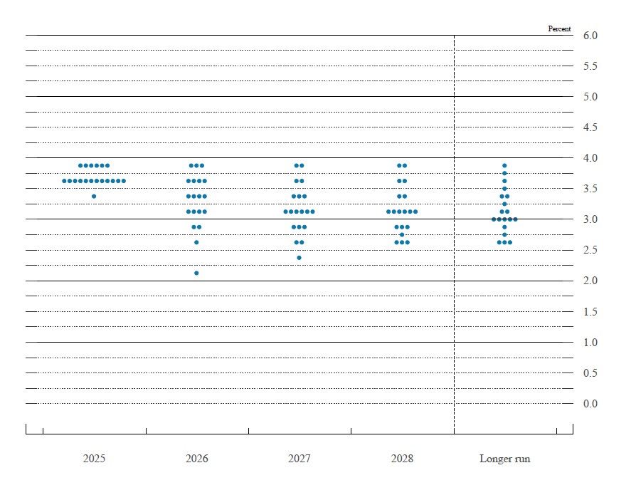3) прогноз роста ВВП на 2026 г заметно повышен, прогноз инфляции снижен, медианный прогноз по-прежнему предполагает одно снижение процентной ставки на 25 б.п. в 2026 г и еще одно в 2027 г (рынок рассматривает как основной вариант 2 снижения ставки в будущем году),