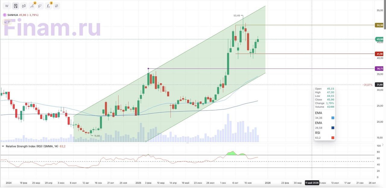 После ралли с конца июня акции скорректировались к уровню в CNY 41,4. При наличии позитивного новостного фона котировки могут протестировать историческую вершину в районе CNY 50,4–53,5. Однако существуют риски дальнейшей коррекции, где зонами поддержки могут стать уровни CNY 41,4 и CNY 36,7.
