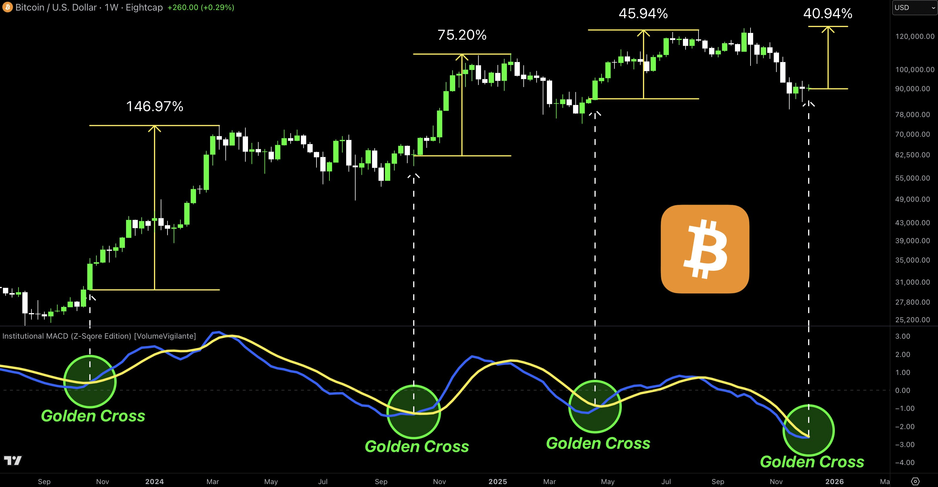 На недельном графике биткоина появился технический сигнал, который в прошлых циклах предшествовал сильным движениям. Речь идет о «золотом кресте» Institutional MACD.