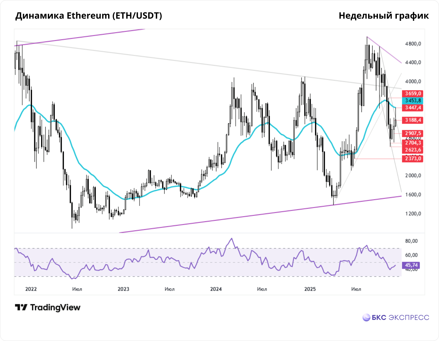 • Среднесрочный расклад постепенно меняется в лучшую сторону. Восходящий тренд от начала апреля 2025 г. был сломлен. С максимума в районе $4950 актив скорректировался на 47%. От локальных минимумов, установленных выше $2600 отскочили уже на более чем 20% и пробили среднесрочный нисходящий канал.