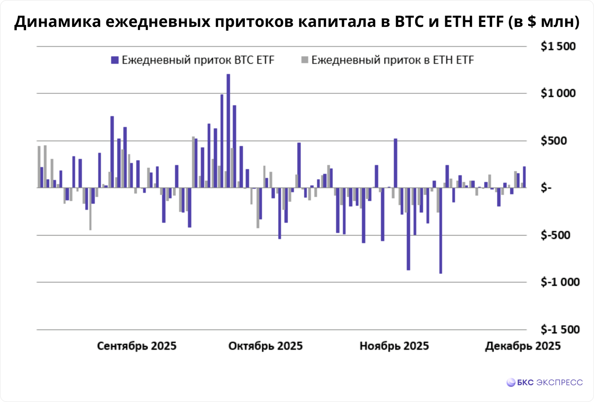 • Динамика в ETF-фондах стабилизировалась. Крупные оттоки прекратились, но и притоки при этом относительно небольшие. Капитал как бы законсервирован. Управляющие фондами не хотят сильно рисковать в конце года. За вчера: +$223 млн в BTC ETF и +$57 млн в ETH ETF.