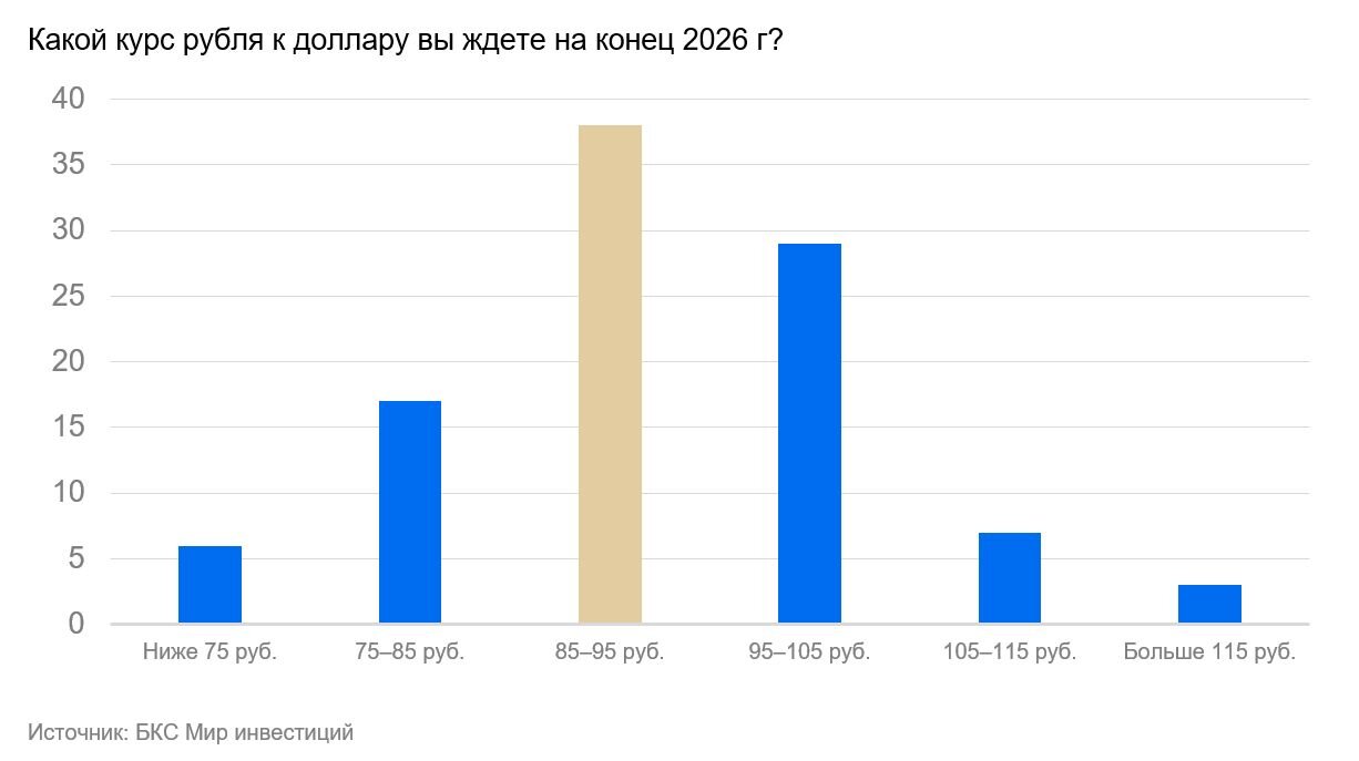 Несмотря на то, что инвесторы и не считают курс рубля важным фактором, о чем мы писали выше, они продолжают ожидать ослабление рубля до 92 за доллар на конец 2026 г. И доля таких инвесторов составляет 77% от опрошенных.