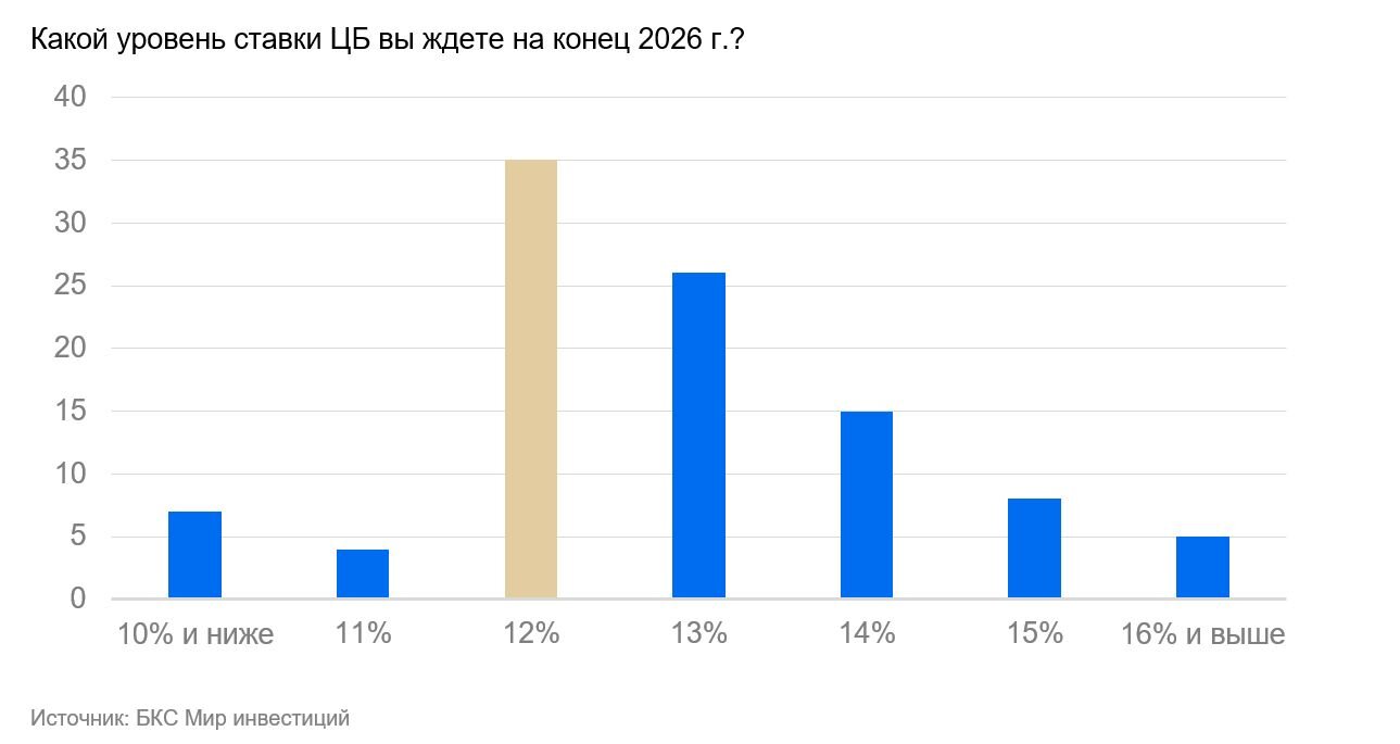 Рынок в среднем ждет ставку ЦБ РФ на уровне 12,5–13% на конец 2026 г. Отметим также, что порядка 90% опрошенных видят ставку на уровне 14% и ниже, то есть снижение в следующем году должно быть неизбежным.