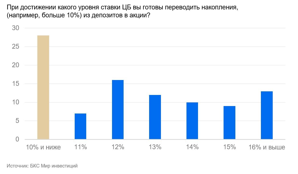 ✔️ Наш взгляд: ожидания БКС тут соответствуют результатам опроса и немного оптимистичнее прогнозов консенсуса в 21%. Полагаем, что рынок акций в следующем году должен сильно выиграть от снижения ставки ЦБ РФ. По нашим оценкам, акции и облигации учитывают ставку на уровне 14–15% на конец года, и снижение ставок больше столкнет акции с текущей мертвой точки и может привести к росту цен, за счет ускорения перетока средств из депозитов.