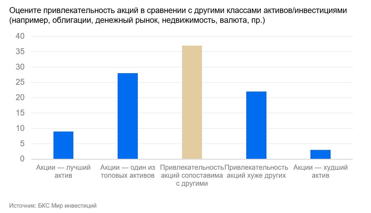 Далее мы опросили инвесторов на тему приоритетности инвестиций в акции сейчас в сравнении с другими классами. И тут опрос подтвердил, что привлекательность акций сопоставима с другими доступными инвестициями.
