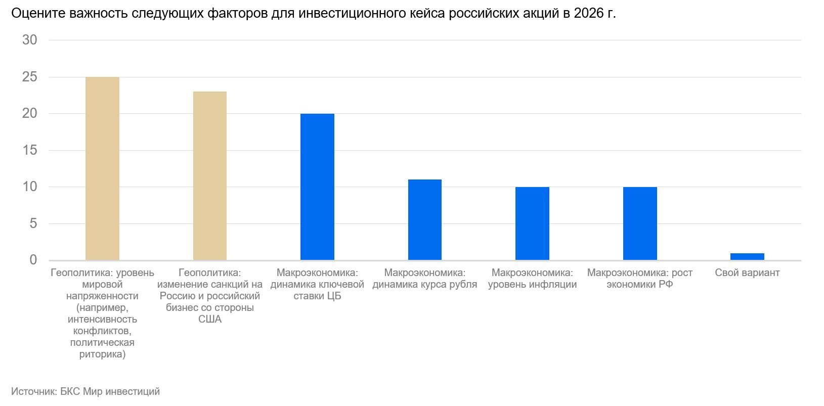 Мы проанализировали, какие факторы наиболее важны для тех инвесторов, кто готов переводить деньги из депозитов в акции (14% и выше). В этом разрезе картина не отличается от опроса всех инвесторов: геополитика остается ключевым фактором при принятии решения об инвестиционной привлекательности российских акций.