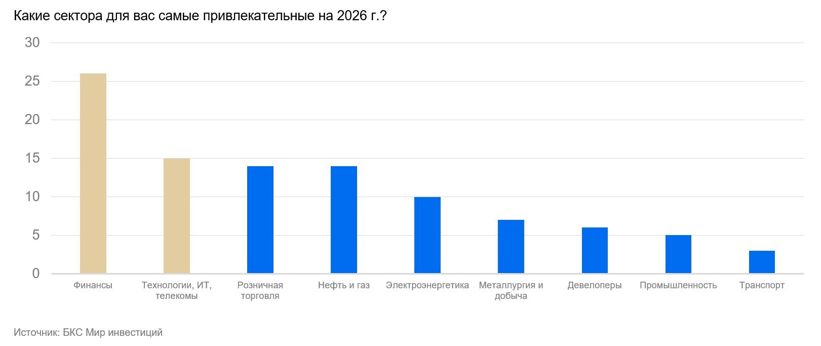 Мы проанализировали выбор фаворитов у участвовавших в опросе: явные фавориты — финансовый сектор и технологии, а экспортеры, нефтегаз и металлургия, на четвертом и шестом месте соответственно.