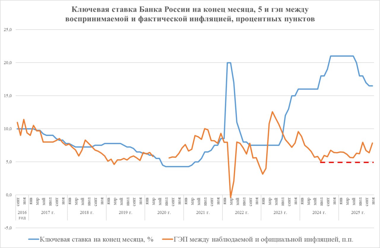 Серьезная проблема: вне зависимости от трендов повышения или снижения ключевой ставки, с июня 2024 г. инфляционные ожидания населения (воспринимаемая инфляция) остаются стабильно высокими с ростом в ноябре 2025 г. На рисунке прилагаю график, где приводится гэп (разница между воспринимаемой и официальной инфляцией) и ключевая ставка. С июня 2024 г. гэп остается стабильным и даже с некоторой тенденцией к росту. Не верит население в снижение инфляции, даже несмотря на очевидное снижение цен на овощи, фрукты и цитрусовые.