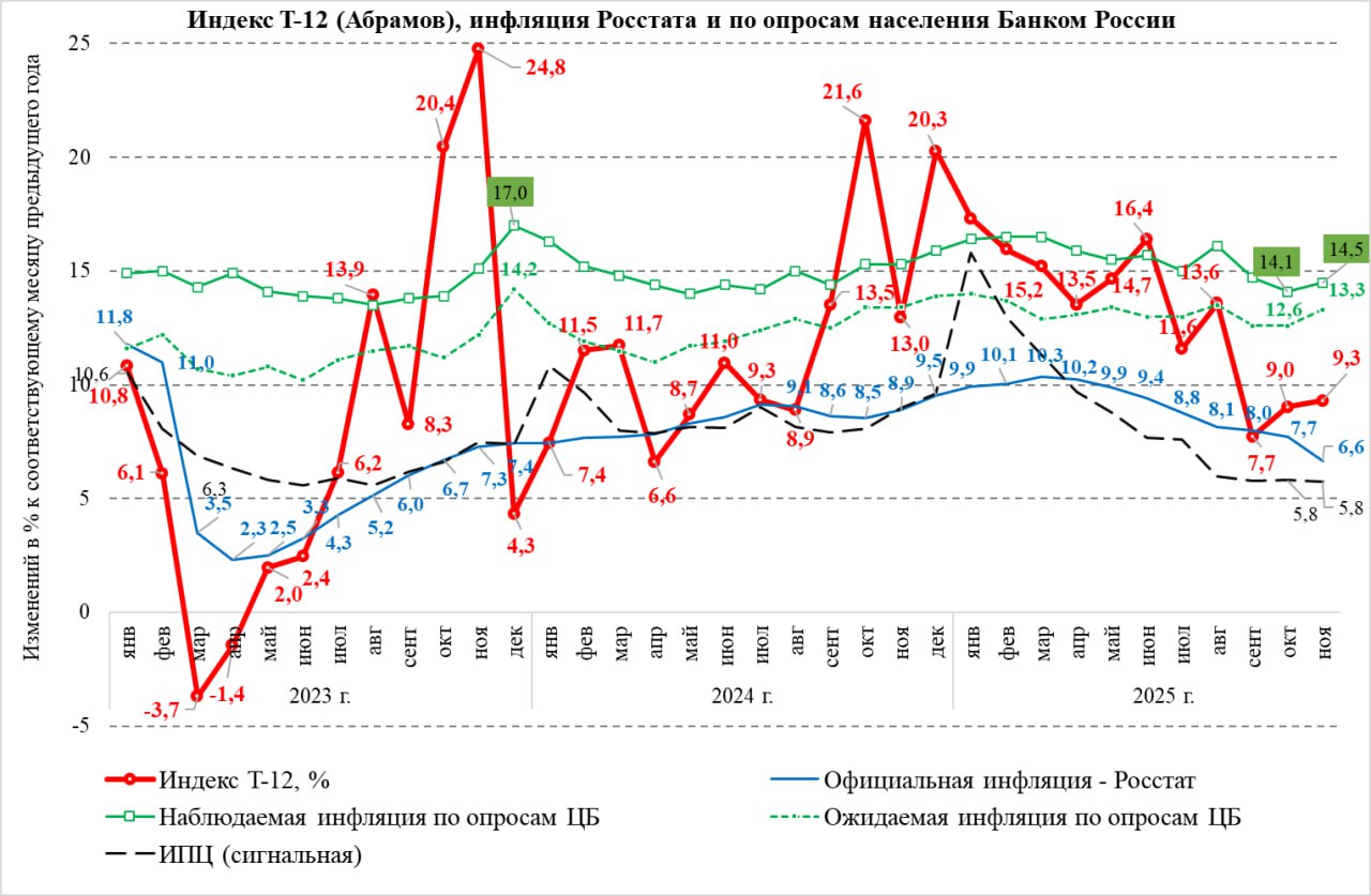 Уже полтора года инфляционные ожидания населения не заякореваются под влиянием ДКП. Текущие причины понятны: сильный рост цен на бензин (мой бензиновый индекс в ноябре 2025 г. практически в 2 раза превышает инфляцию, небывалый факт за 6 лет наблюдений), объявленные повышения тарифов на ЖКХ и услуги общественного транспорта, НДС, утилизационные сборы, ожидание того, что при малейшей возможности производители переложат бремя всех своих финансовых трудностей на потребителей. Да и фактическая инфляция продовольственных товаров (без овощей-фруктов) и тарифы на услуги пошли в рост (см. хотя бы мой график по индексу Т-12).