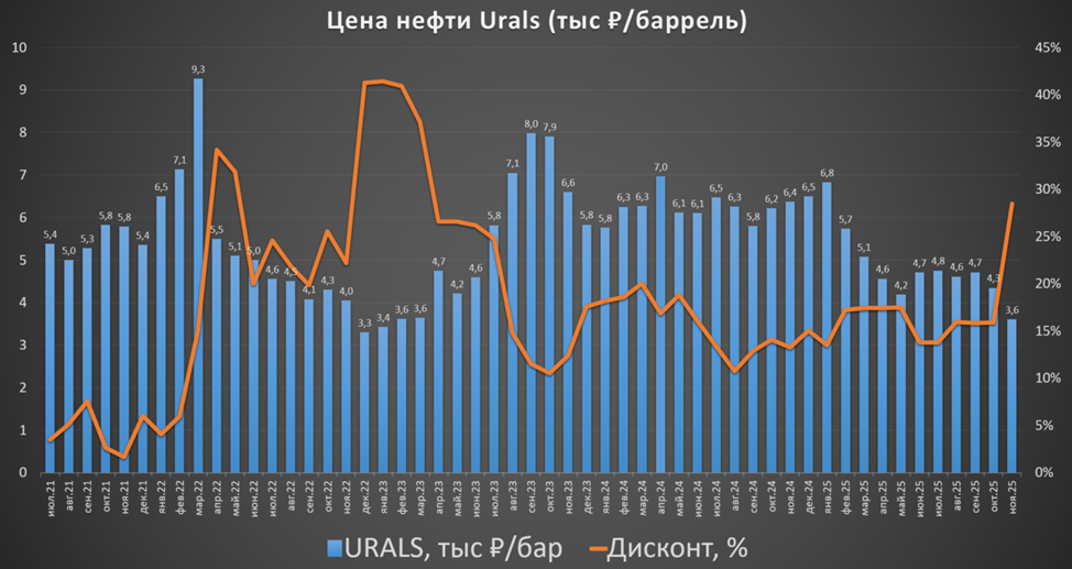 Нефть марки Urals торгуется с дисконтом к BRENT. Сейчас из-за последних санкций, он превышает 25%. Средняя цена Urals в 2025 году составила около 4,8 тыс ₽ за баррель (-22% г/г). Снижение из-за падения цен на нефть, укрепления рубля и санкций.