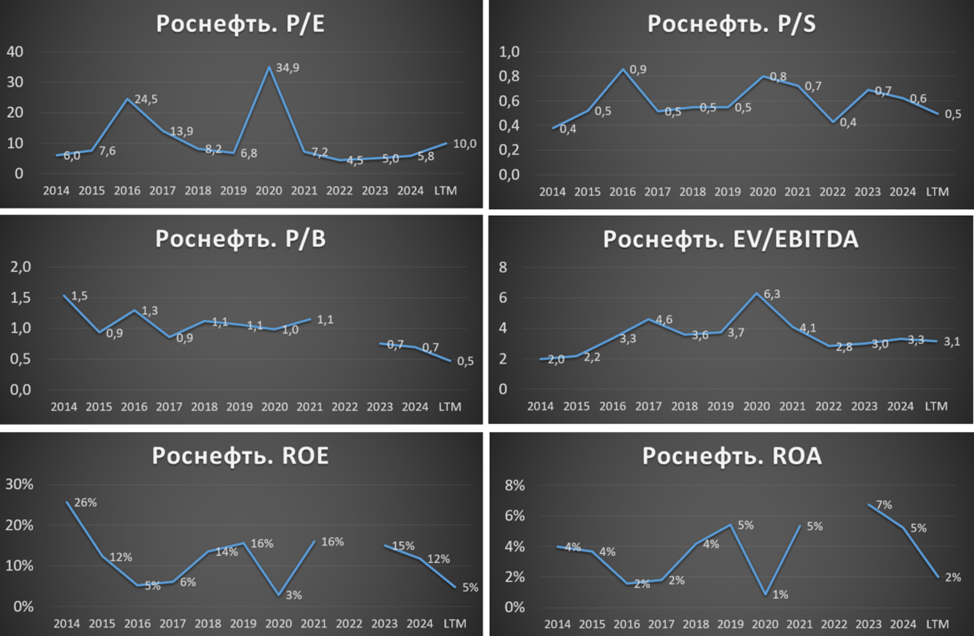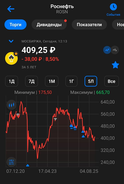 С начала 2025 года акции Роснефти снизились почти на треть, не считая выплаченных дивидендов. Текущие котировки соответствуют средним значениям за 7 лет.