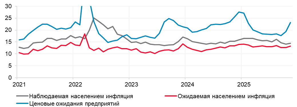 Негативный фактор – увеличение инфляционных ожиданий. Инфляционные ожидания населения в ноябре увеличились - по данным опроса ООО «инФОМ», в ноябре 2025 г. медианная оценка инфляционных ожиданий на годовом горизонте возросла до 13,3% (+0,7 п.п. м/м; -0,1 п.п. г/г), оценка наблюдаемой инфляции также увеличилась до 14,5% (+0,4 п.п. м/м; -0,8 п.п. г/г). Ценовые ожидания предприятий на следующие 3 месяца также повысились, достигнув максимума с января текущего года, особенно в сфере услуг и розничной торговле – средний темп прироста цен, ожидаемый предприятиями розничной торговли на следующие 3 месяца, ускорился до 11,8% г/г (+2,4 п.п. м/м; -1,8 п.п. г/г). Это ожидаемая новость (ЦБ связывает ее с реакцией на предстоящие налоговые новации), но неприятная – регулятор неоднократно отмечал, что инфляционные ожидания населения и бизнеса остаются существенно выше, чем в 2017-19 гг (когда инфляция была близка к цели) и не снижаются, несмотря на замедление инфляции. Это затрудняет снижение устойчивой инфляции и ограничивает для ЦБ пространство для снижения ключевой ставки. Следующий блок данных по инфляционным ожиданиям («Оперативная справка по результатам исследования «Измерение инфляционных ожиданий и потребительских настроений на основе опросов населения» и «Оперативная справка по результатам мониторинга предприятий») выйдут уже на неделе тишины, 17 декабря, и могут повлиять на решение Совета директоров по ключевой ставке.