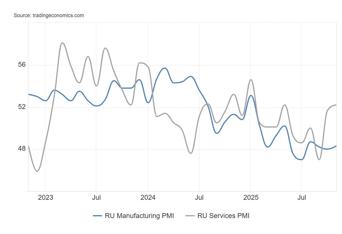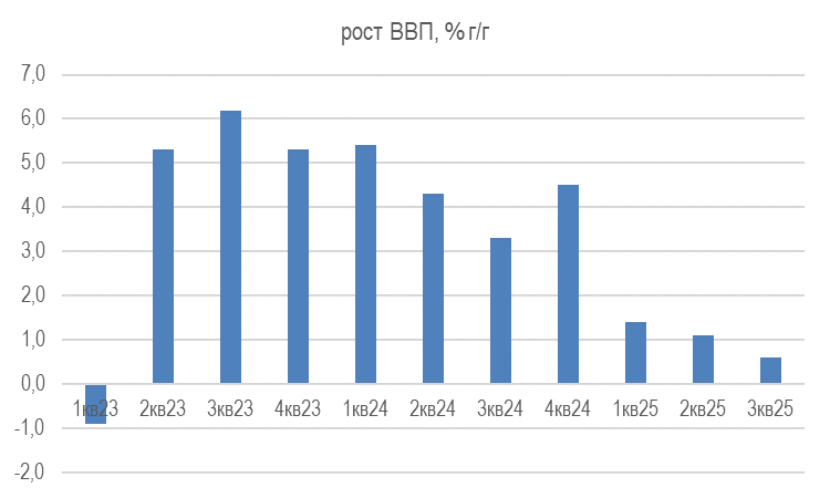 Потребление держится более уверенно - замедление роста в розничной торговле (резкое ускорение в октябре до максимальных в этом году 4,8% г/г в первую очередь обусловлено спросом на импортные автомобили перед изменением методики расчета утильсбора), положительная динамика спроса на услуги, сохранение высоких темпов роста в общепите. Сокращаются прибыли компаний – сальдированный финансовый результат в январе-сентябре этого года снизился на 7,7% г/г, отмечается рост просроченной дебиторской задолженности, проблемных кредитов (особенно в МСБ и рознице). Рост инвестиций в основной капитал за 9М25 замедлился до 0,5% г/г по сравнению с 9,0% г/г за 9М24, а в 3кв25 инвестиции впервые с 2020 г сократились по отношению к аналогичному периоду прошлого года. При этом поддержку экономическому росту в этом году оказывают все еще высокие темпы роста зарплат, более сильный, чем первоначально закладывалось в бюджетные параметры, бюджетный импульс, ослабление ограничений ОПЕК+ на добычу нефти и позитивная мировая конъюнктура на ряд товаров российского ненефтегазового экспорта (драгметаллы, цветные металлы, удобрения).