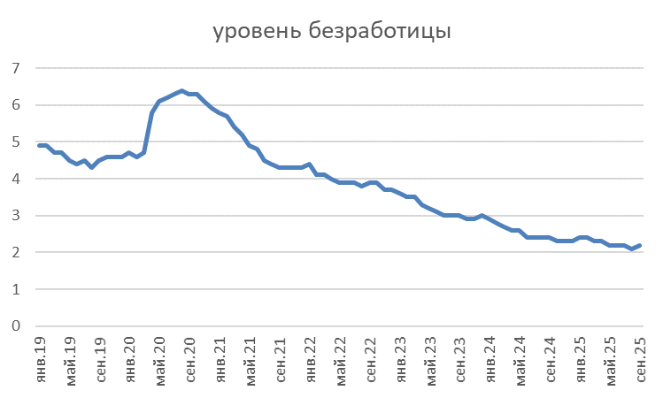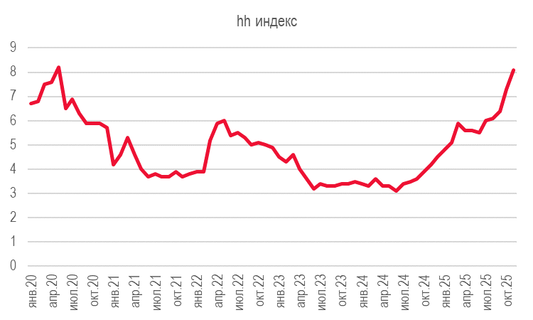 Рынок труда – признаки ослабления напряженности. Хотя безработица в октябре (2,2%) осталась вблизи исторических минимумов и предприятия по-прежнему называют кадровый дефицит одним из основных ограничений расширения выпуска, рост зарплат заметно замедлился в августе (с 16% до 12,2%) и немного ускорился в сентябре (13,1%) – в целом динамика снижается по отношению к 2024 г. (9М25 14,3% против 18,0% за 9М24), но пока остается повышенной. При этом оперативные данные (hh индекс, который близок к максимуму, по крайней мере, с 2020 г) указывают на быстрое нарастание конкуренции работников за рабочие места, что должно привести и к замедлению роста зарплат. Если этот тренд получит продолжение, это может стать еще одним подтверждением, что рынок труда выходит из «перегрева» и что инфляционные риски с его стороны снижаются, что позволит ЦБ более уверенно снижать ключевую ставку.