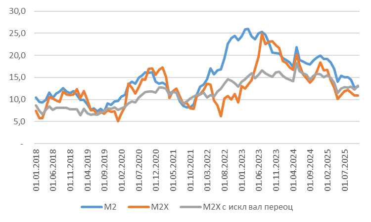 Активизация кредитования в октябре привела к ускорению роста денежных агрегатов - денежная масса в национальном определении (М2) выросла на 1,5% после сокращения на 0,3% в сентябре, а широкая денежная масса (М2Х) – на 1,7%, после роста на 0,6% месяцем ранее, годовые темпы выросли до 13,0% и 13,1% против 12,7% и 12,2%. По оценке Банка России, в ноябре денежные агрегаты росли сопоставимыми темпами (M2 1,5% м/м, М2Х 1,3% м/м), годовые темпы изменились разнонаправленно (рост М2 снизился до 12,5%, а М2Х увеличился до 13,3%). Между тем, аналитики Банка России считают, что «октябрьская динамика кредитования в целом соотносилась с траекторией возвращения инфляции к 4%» и «рост денежной массы может вписаться в прогнозный диапазон Банка России на конец 2025 г. (7–10%)», поскольку кредитный импульс в этом году остается отрицательным, а сезонный скачок денежных агрегатов в ноябре-декабре 2025 г ожидается меньше обычного из-за более равномерного распределения бюджетных расходов внутри года.