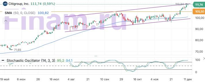 С точки зрения технического анализа на дневном графике акции Citigroup достигли верхней границы среднесрочного восходящего канала. Бумаги выглядят локально перекупленными, ожидаем формирования коррекции с ближайшей целью на поддержке $105,5.