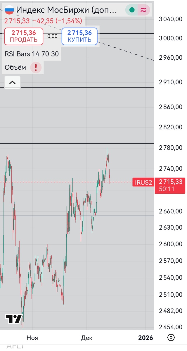 На следующей неделе будет очень весело. Высокая волатильность гарантирована. Ожидаю пик снижения ближе к середине недели. Высока вероятность тестирования 2600 по ММВБ.