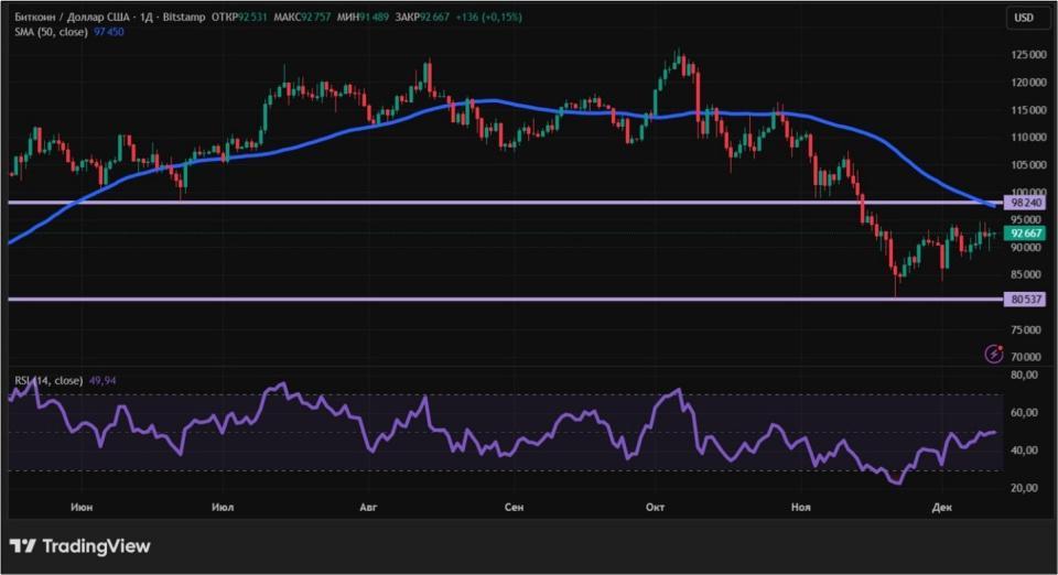 С 5 по 12 декабря 2025 года биткоин прибавил около 3,5%. Всю неделю BTC безуспешно пытался штурмовать высоту $95 000. Но баланс сил между покупателями и продавцами на этот раз оказался максимально равным: четыре торговые сессии роста и три падения.