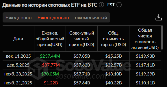 Спотовые ETF на биткоин продолжают чередовать недели, фиксируя то отток, то приток денежных средств. На этой неделе пришел черед криптоинвесторам вносить деньги. Правда, общий недельный размер инвестиций в $237,44 млн — достаточный скромен. Это особенно заметно, если сравнить недельные показатели с началом октября, когда семидневный приток денежных средств дважды превышал $2,7 млрд. По сути, инвесторы до сих пор предпочитают занимать выжидательную позицию, надеясь, что скоро появятся более четкие катализаторы для роста крипторынка.