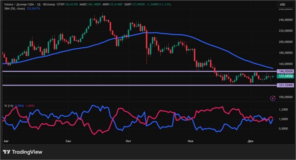 С точки зрения технического анализа, Solana на протяжении последнего месяца находится в боковике между уровнем поддержки $121,5 и уровнем сопротивления $146,9. Тем не менее, если у кого-то и есть инициатива, то явно у продавцов (медведей). Это подтверждается индикаторами. Цена находится ниже 50-дневной скользящей средней (отмечена синим цветом), а линия VI- (розовая) индикатора Vortex находится выше VI+ (фиолетовой). Расстояние между ними очень маленькое, и это также подтверждает слабость тренда.
