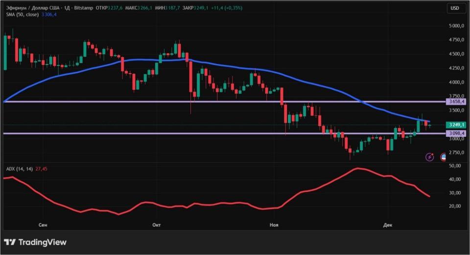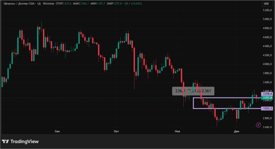 Стоимость эфира с 5 по 12 декабря увеличилась на 7,81%. Лишь одна из семи торговых сессий на неделе, в четверг, 11 декабря, оказалась для ETH минусовой. Вторая по капитализации криптовалюта смогла закрепиться выше $3200.