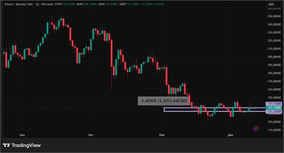 Стоимость Solana с 5 по 12 декабря поднялась на 3,3%. Волатильность SOL остается достаточно низкой. На прошедшей неделе лишь раз цена по итогам дневных торгов изменилась более чем на 1,5%.