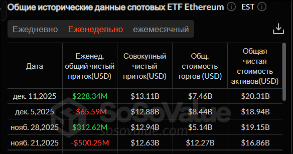 Спотовые ETH-ETF зафиксировали на неделе приток денежных средств в размере $228,34 млн. Лишь 11 декабря инвесторы предпочли изъять деньги из биржевых фондов. Во все остальные, наоборот, инвесторы по большей части вкладывали средства. Как и в случае со спотовыми ETF на биткоин, биржевые фонды на эфир демонстрируют смешанную динамику вот уже четыре недели подряд, чередуя приток и отток денежных средств. Среди инвесторов продолжает царить неопределенность.