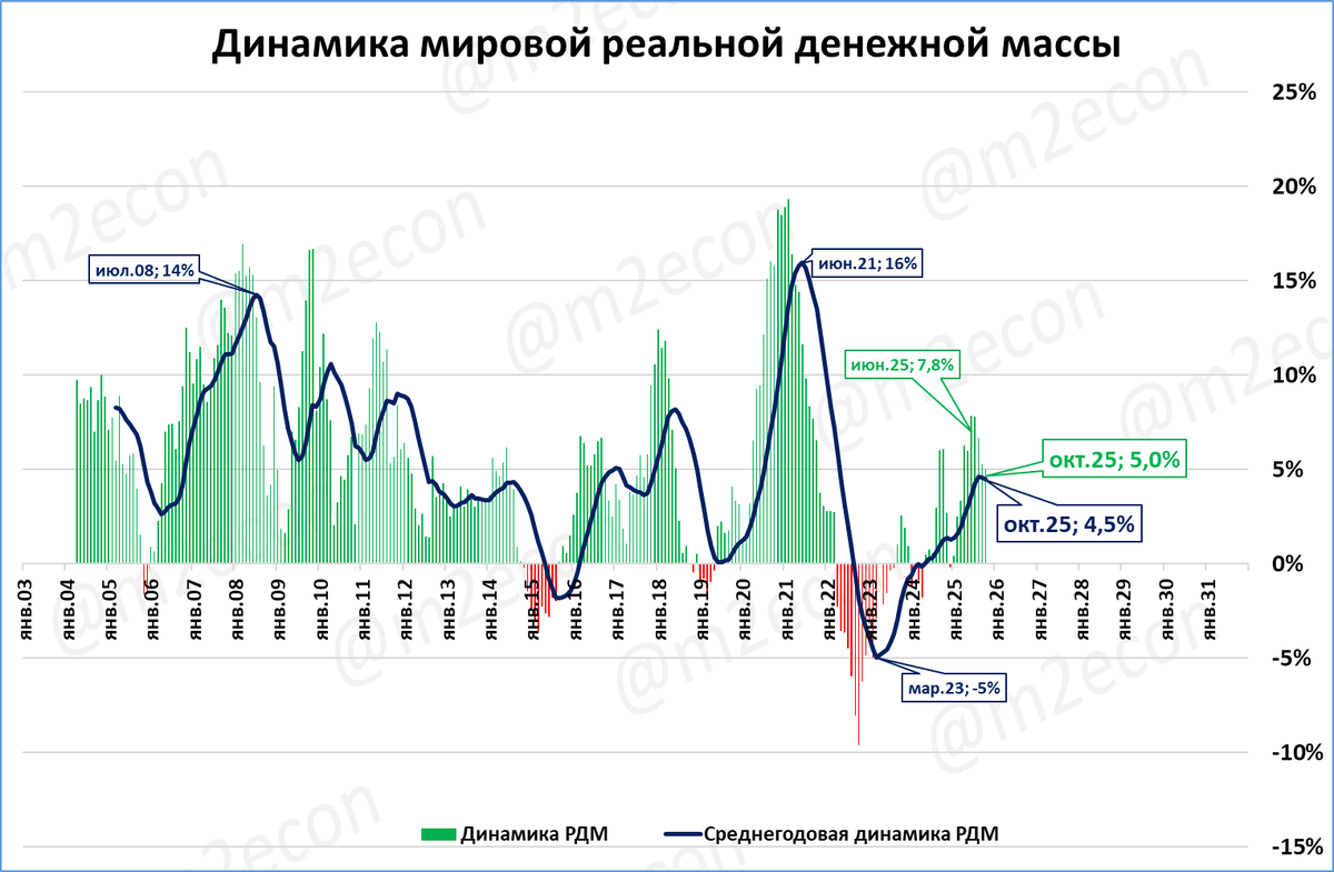 Темп роста РДМ держится 5% годовых и выше. Для 2012-2025 гг. это неплохие темпы. Со стороны реальной денежной массы рисков для мировой экономики не наблюдается.