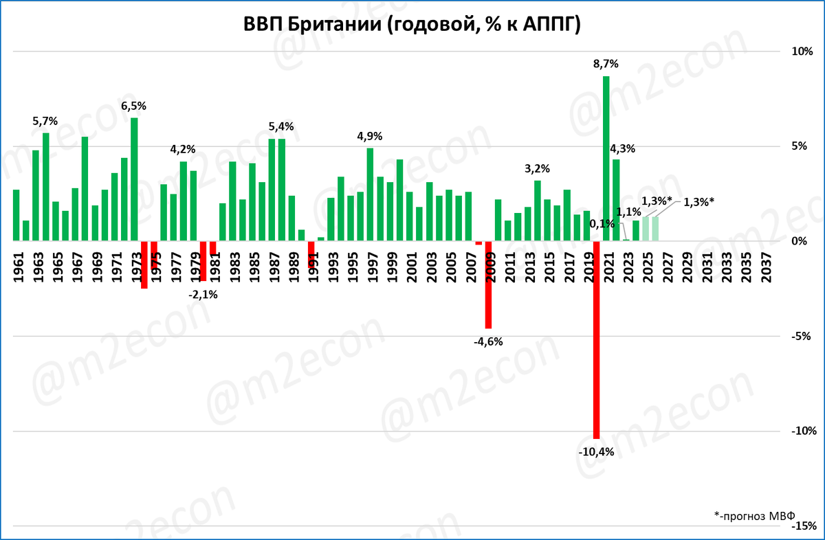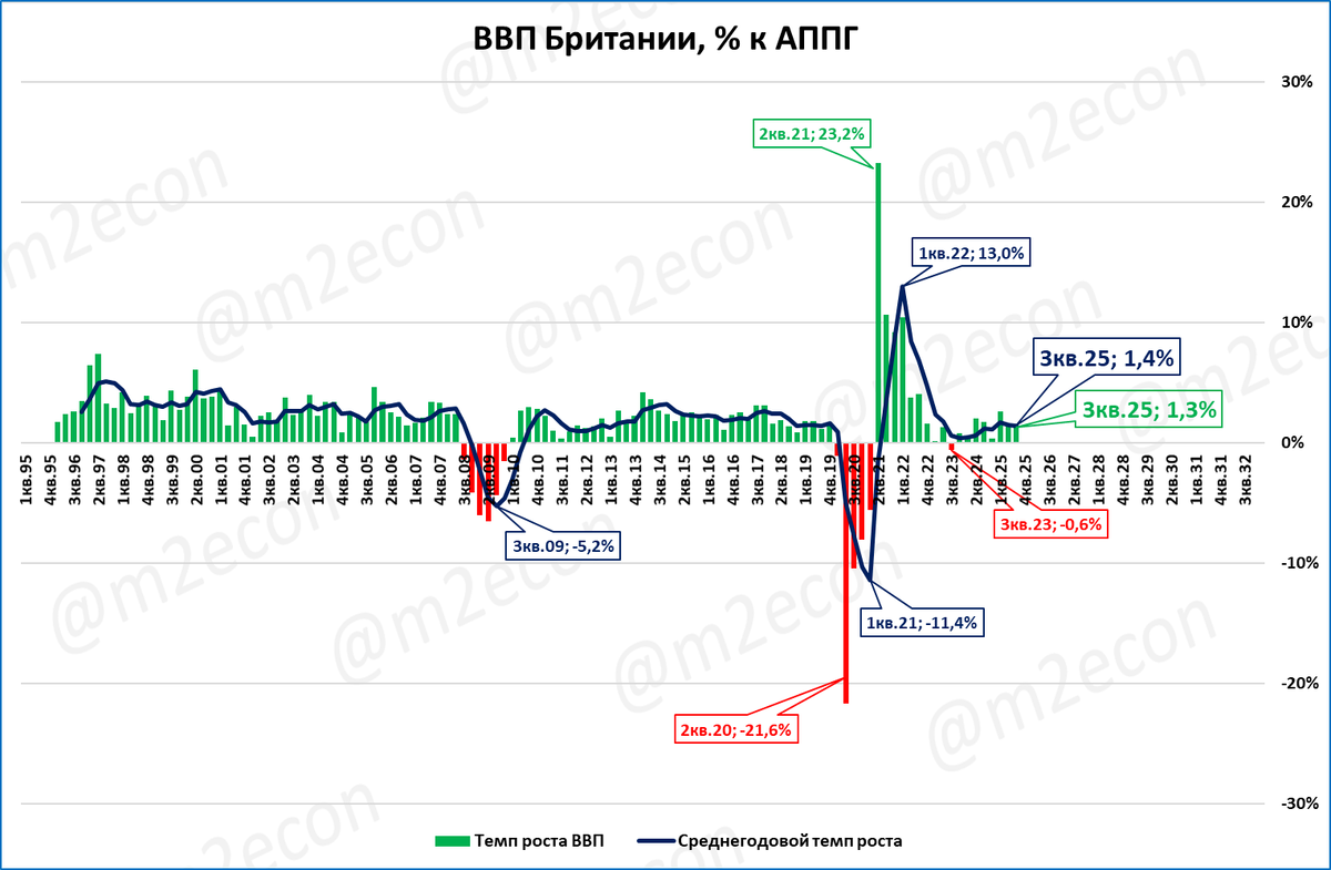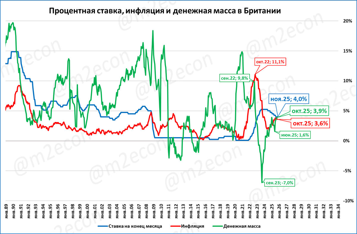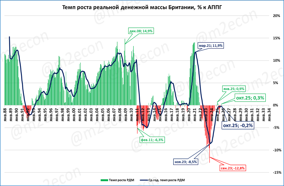 В октябре реальная денежная масса Британии выросла, +0,3% к октябрю 2024 года. В 3 кв. ВВП вырос на 1,3% к третьему кв. 2024 года.