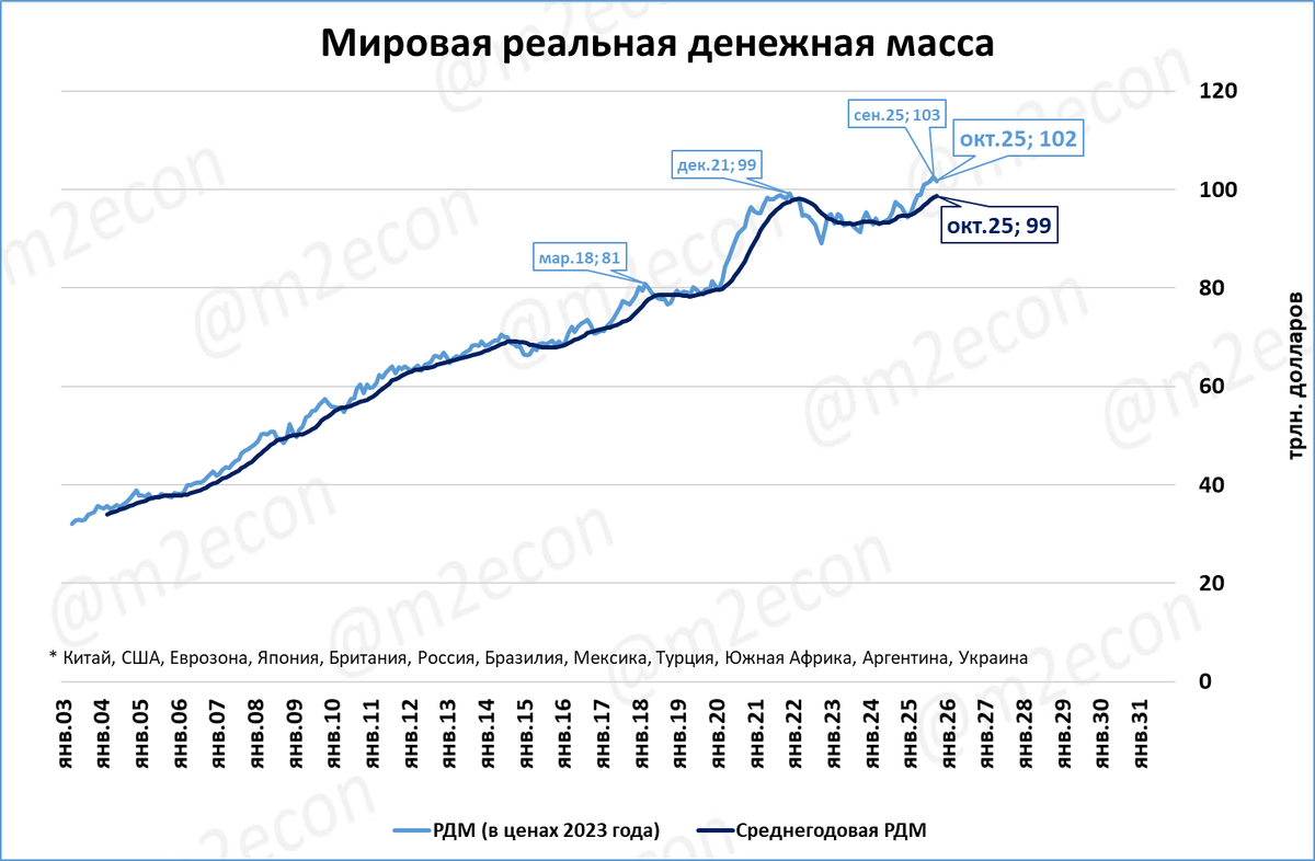 В дальнейшем, для краткости, этот показатель обозначен “мировой денежной массой” или “глобальной денежной массой”. В октябре глобальная денежная масса составила 104,7 трлн в долларовом эквиваленте, в прошлом месяце было больше (105,3).