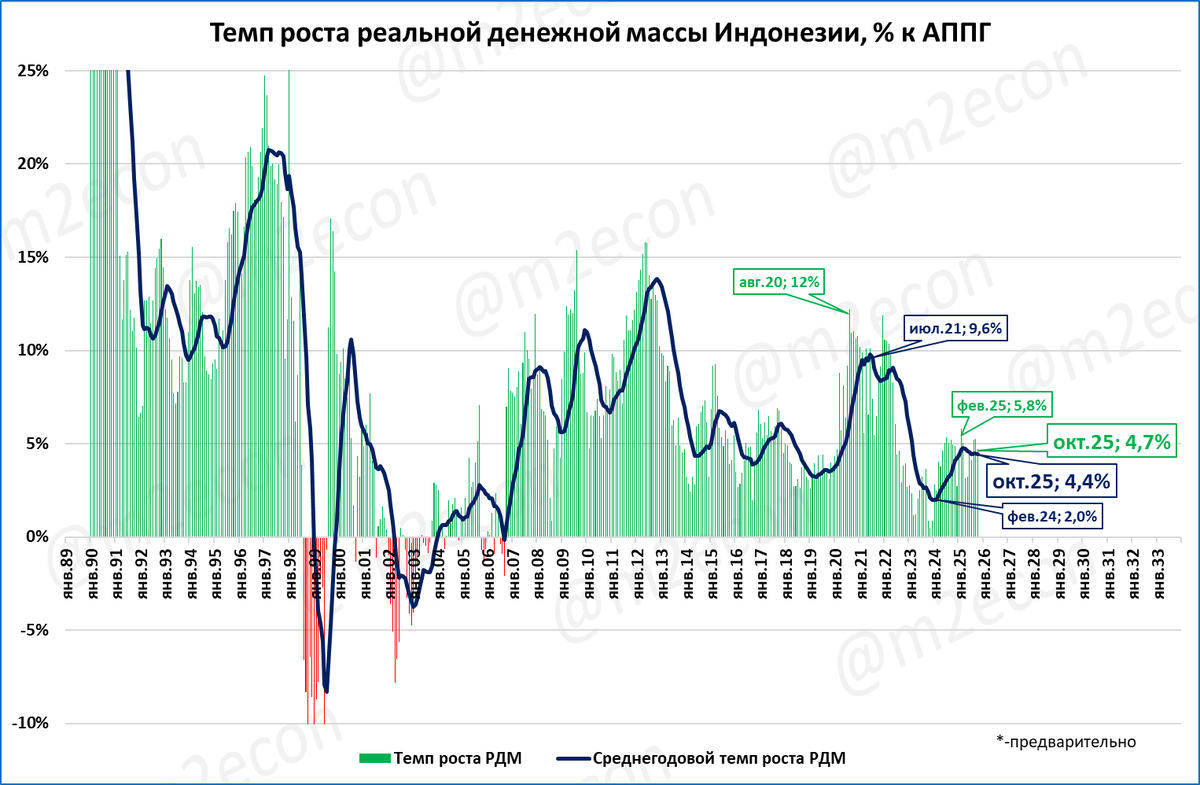 В Индонезии рост РДМ в октябре составил 4,7% к аналогичному периоду 2024 года. ВВП в 3 квартале вырос на 5,0% к 3 кварталу 2024 года.