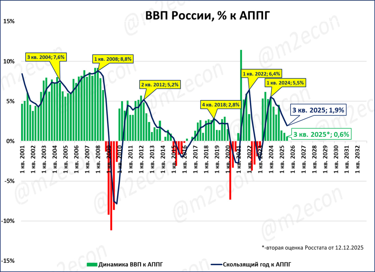 ВВП в 3 квартале вырос на 0,6% к 3 кв. 2024 года по второй оценке Росстата. Рост в 4 квартале и в целом за 2025 год может превысить 1%.