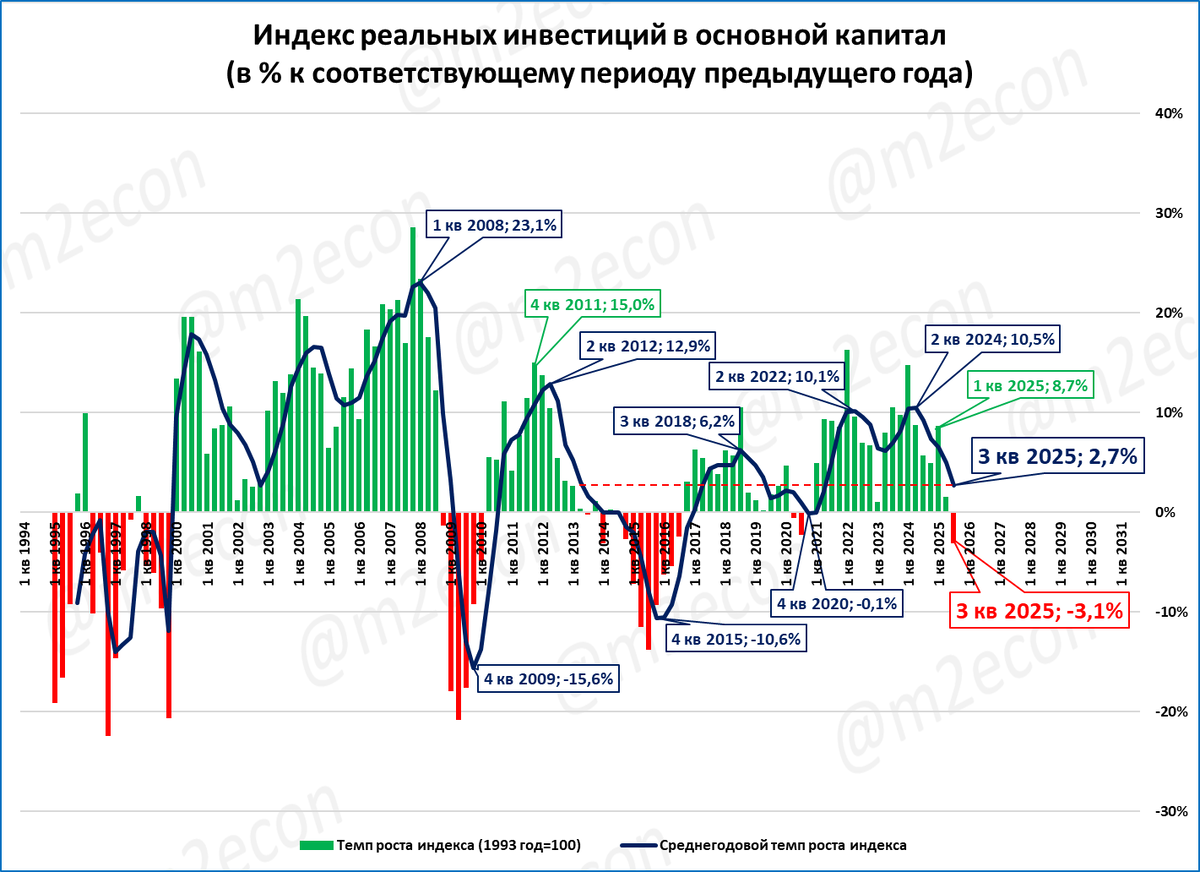 В последний раз столь сильное падение наблюдалось в 2016 году, когда экономика выходила из затяжного кризиса 2014-2015 годов. Среднегодовой темп роста инвестиций (синяя линия на графике выше) опустился до 2,7%. По итогам 2025 года он будет ещё ниже.